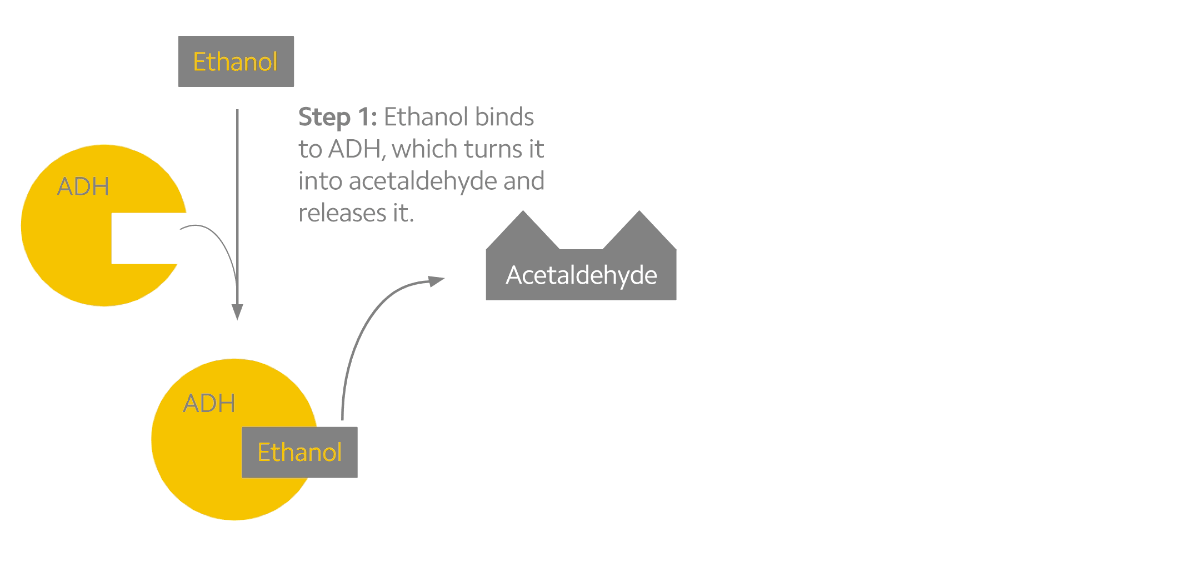 Alcohol metabolism in the body. Ethanol is converted to acetaldehyde by the ADH enzymes (yellow). Acetaldehyde is then rapidly converted to acetate by the ALDH enzymes (pink).