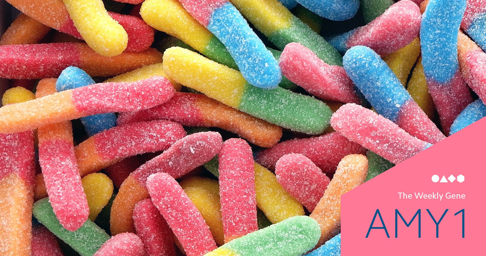 The AMY1 gene has ancient origins dating back more than 100 million years ago. Originally, the AMY2 gene was the only amylase gene. But a gene duplication event took place which caused there to be two copies of the AMY2 gene. Over time, this duplicate gene accumulated small changes in its DNA sequence which caused it to become its own gene. Now, we know AMY1 as salivary amylase, and AMY2 as pancreatic amylase. As their names suggest, the two genes are turned on in different parts of the body, but they both serve a function in digesting starches.1