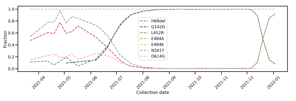Figure 2: Prevalence of key Spike mutations over time. For the period 2021-12 to 2022-01, the trajectories of Omicron mutations H69del, E484A, and N501Y exactly overlap, as do those of Delta mutations G142D and L452R. (Sequence data prior to June 2021 generated by Illumina.)