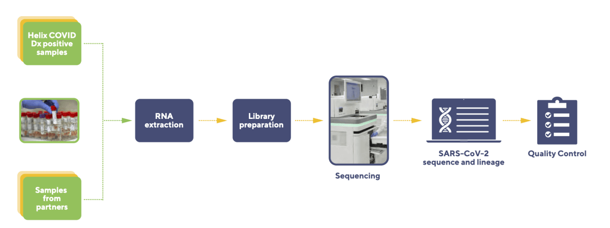 We receive remnant specimens (Saline, Saliva, Universal Transport Medium) that tested positive for SARS-CoV-2 by qPCR from collaborators or from internal diagnostic testing at the Helix laboratory. Following accessioning, specimens are incubated in a laboratory oven using a preset protocol(s) that heat-inactivates the SARS-CoV-2 virus. Samples are then subject to RNA extraction, followed by RNA library preparation, and then SARS-CoV-2 genome capture. Next-generation sequencing is accomplished using the NovaSeq Sequencing system.