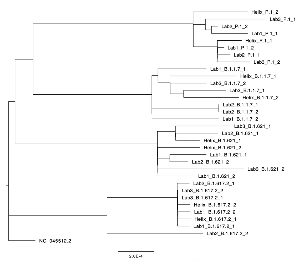 Another external corroboration of sequencing accuracy is a phylogenetic analysis combining sequences originating from Helix’s diagnostic lab with sequences from other commercial or public health labs. Any systematic biases in Helix’s sequencing pipeline should manifest in a non-random distribution of Helix sequences in the phylogenetic tree. To this end, Figure 3 depicts the phylogenetic relationships for a random subset of sequences downloaded from GISAID, all originating from the state of Florida, USA, with collection dates in the week June 25-July 1, 2021. This period of time was chosen due to the high lineage diversity that week: Alpha (B.1.1.7), Delta (B.1.617.2), Mu (B.1.621), and Gamma (P.1) were all present at non-trivial frequencies. As can be seen, within each lineage, the samples originating from Helix are interspersed among samples originating from other labs, indicating that sequences generated by Helix’s workflow are just as similar to sequences generated by other labs as they are to other Helix-generated sequences.