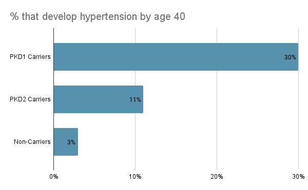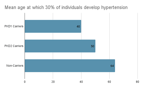 1. In the general population, PKD1/2 carriers develop hypertension a mean of 11 years before their kidney disease diagnosis, which is, on average, 10 years earlier than non-carriers. 30% of PKD1 carriers have hypertension by age 40, compared with 11% of PKD2 carriers and only 3% of non-carriers. Comparatively, it takes until age 50 for 30% of PKD2 carriers to develop hypertension and until age 64 for 30% of non-carriers to develop hypertension. After the onset of hypertension, the progression to kidney disease is rapid for PKD1 carriers and is associated with increased incidence of severe morbidity.