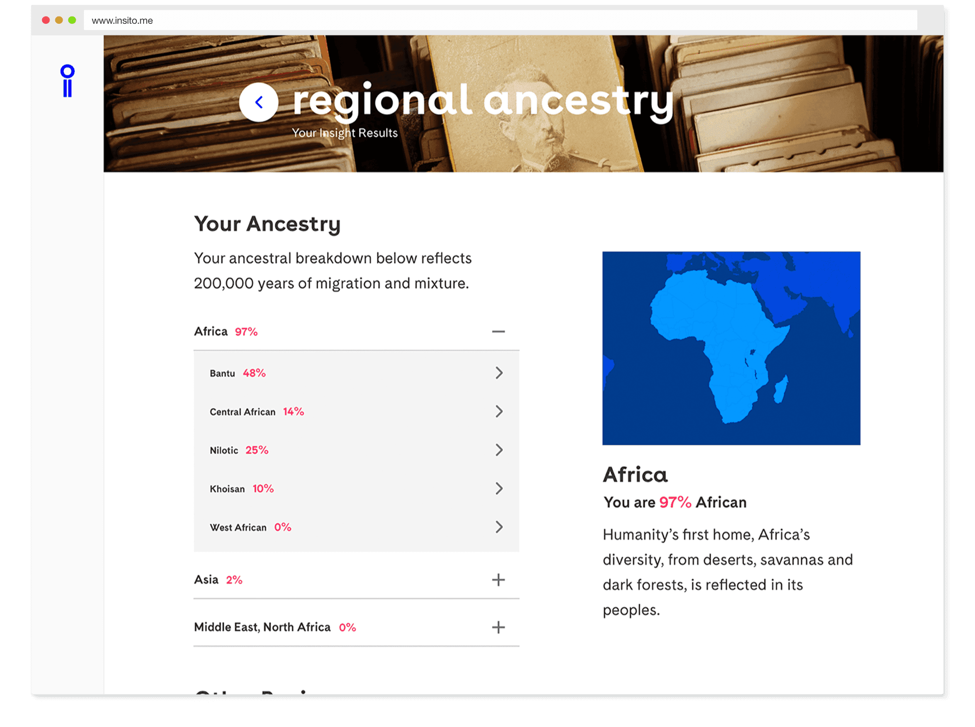 Are you most interested in the geography of your ancestry? Consider Regional Ancestry by Insitome. This product offers detailed insights on what portions of your DNA came from ancestors on which continents—then it goes a step further, exploring your origins by region. Are you more Bantu or Basque? Regional Ancestry can help you find out. Available for web and iOS.