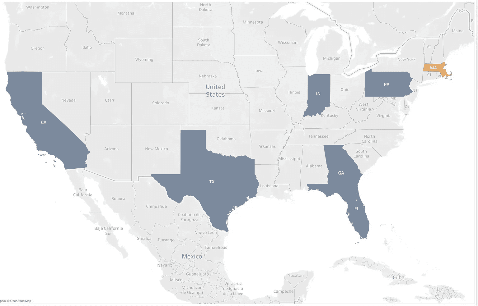 - B.1.1.7 has been found in 4 of the 5 states where we have statistical power to detect it (CA, FL, PA, IN), as well as 3 additional states where we are underpowered (GA, TX, MN).