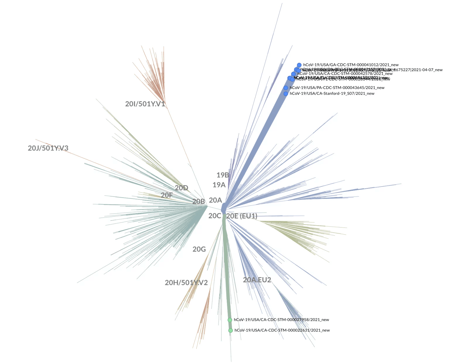 Figure 1: Phylogenetic tree with subset of L452R+E484Q samples in Table 1 on background of global SARS-CoV-2 diversity. Note that the two B.1.429 samples with L452R+E484Q are in a different nextclade clade (20C, green) from the B.1.617 samples and two independently sequenced California B.1.617 samples (20A, blue). Generated using https://clades.nextstrain.org/ and selecting “Show Tree” > “Unrooted” layout.