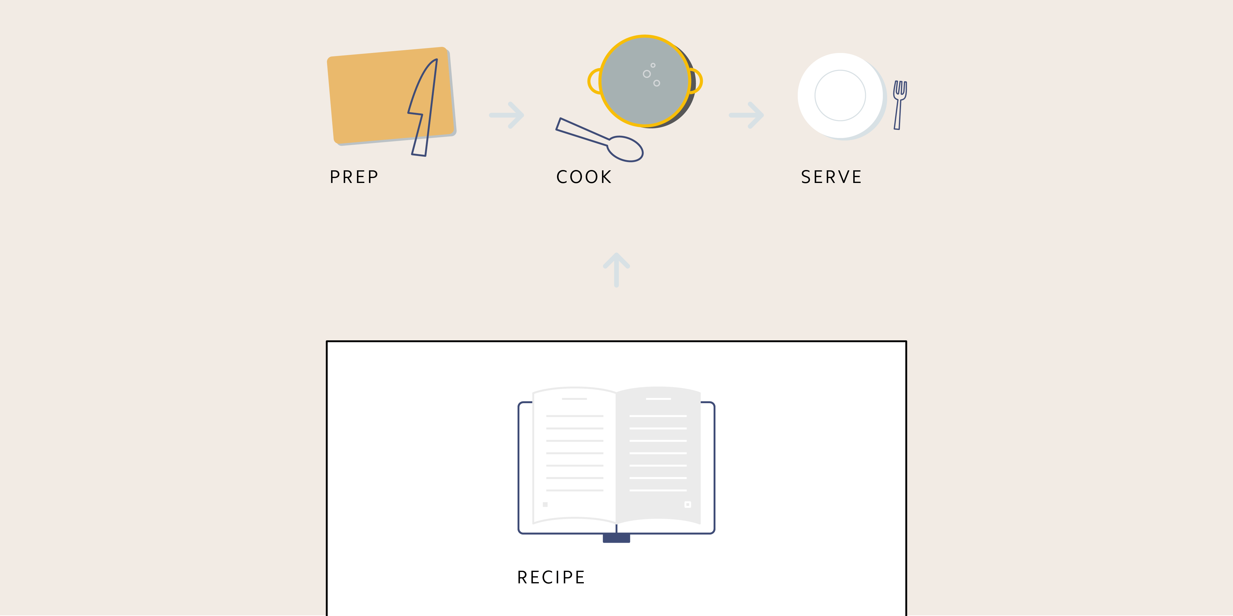 Information from the DNA is coded into mRNA. That mRNA leaves the nucleus of the cell (the white region) and is used by ribosomes to create other proteins. Similarly, information from a cookbook can be relayed to a person preparing a meal. Using cooking utensils and the instructions from the cookbook, the meal is made and ready to serve.