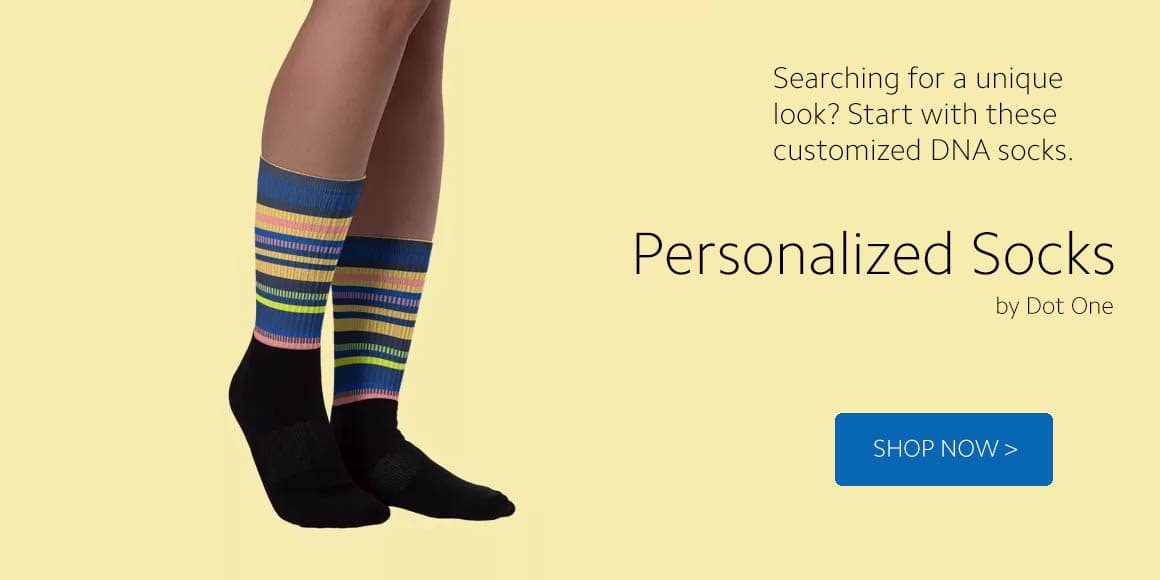 - Personalized Socks: Why wear your heart on your sleeve when you can wear your DNA on your feet? These black socks have bands of color running up the ankles, customized using 33 positions in your DNA.