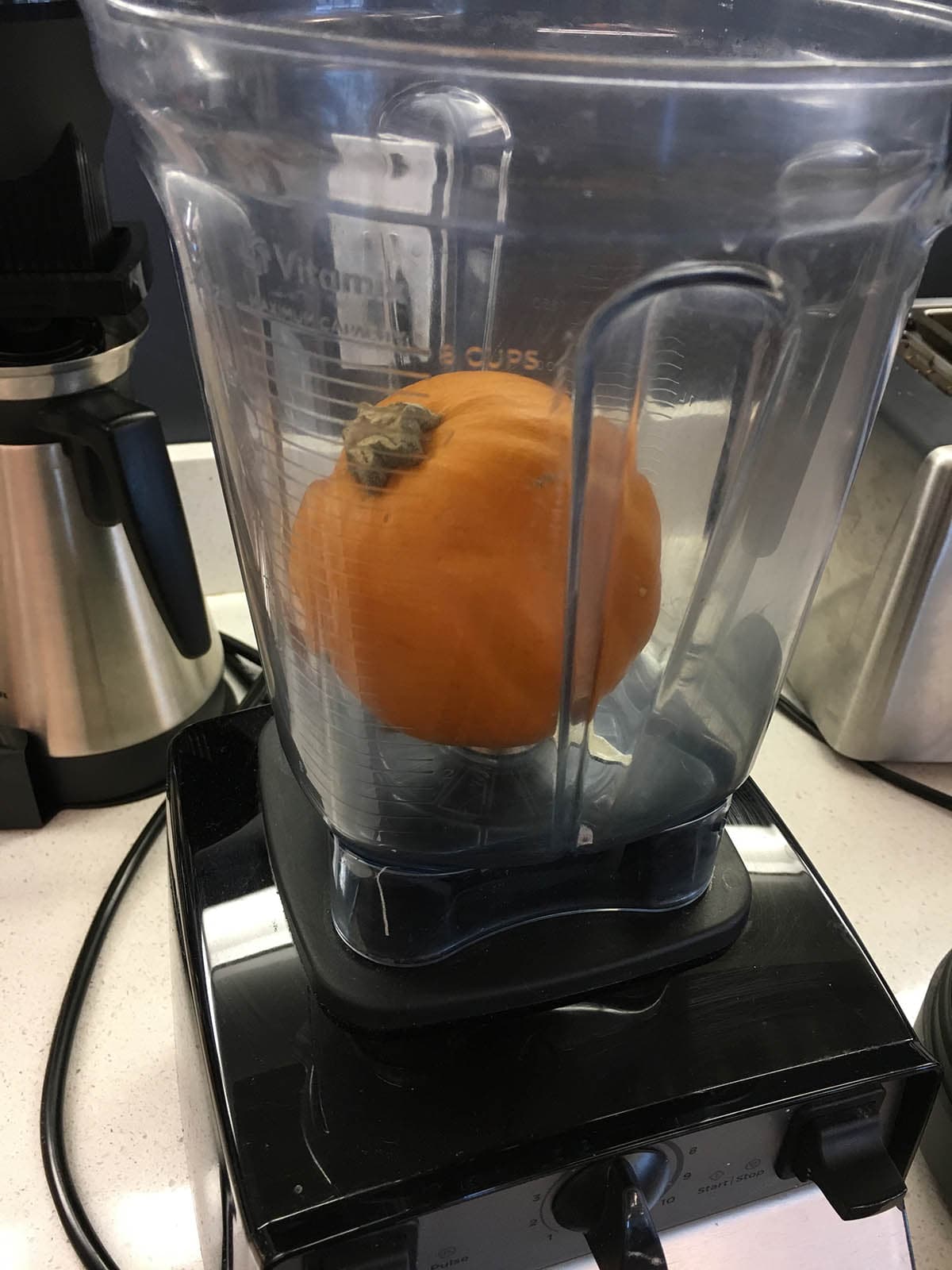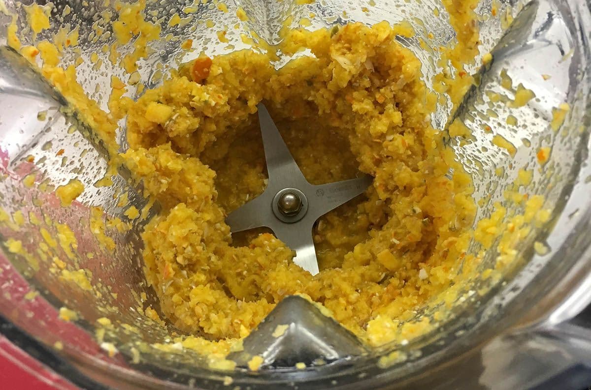 To get the DNA out, we’ll need to grind or mash up the pumpkin into a paste. I used a blender, but you could also use a food processor or mortar and pestle. It helps to chop the pumpkin into smaller pieces, and you might need to add some water to help with the blender.
