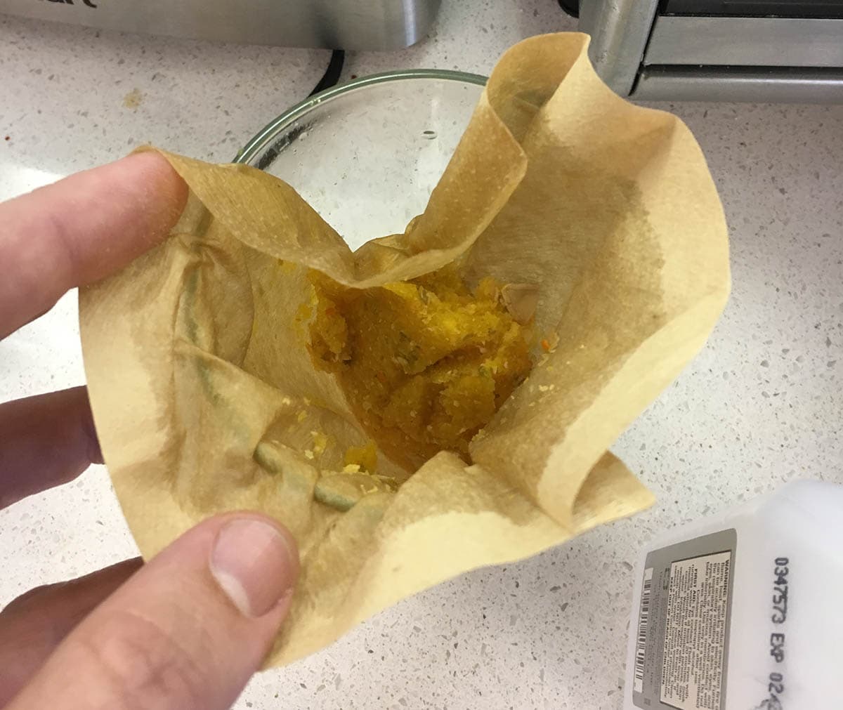 Now that all of the DNA is released into our soapy pumpkin mixture, we need to filter out the solids. Place a coffee filter (or cheesecloth or other strainer) over a clean glass and transfer everything into the filter (you may want to use a funnel or other strainer, or just carefully hold the filter with your fingers; if the filter rips or falls over, just transfer everything into a fresh filter over a new cup).