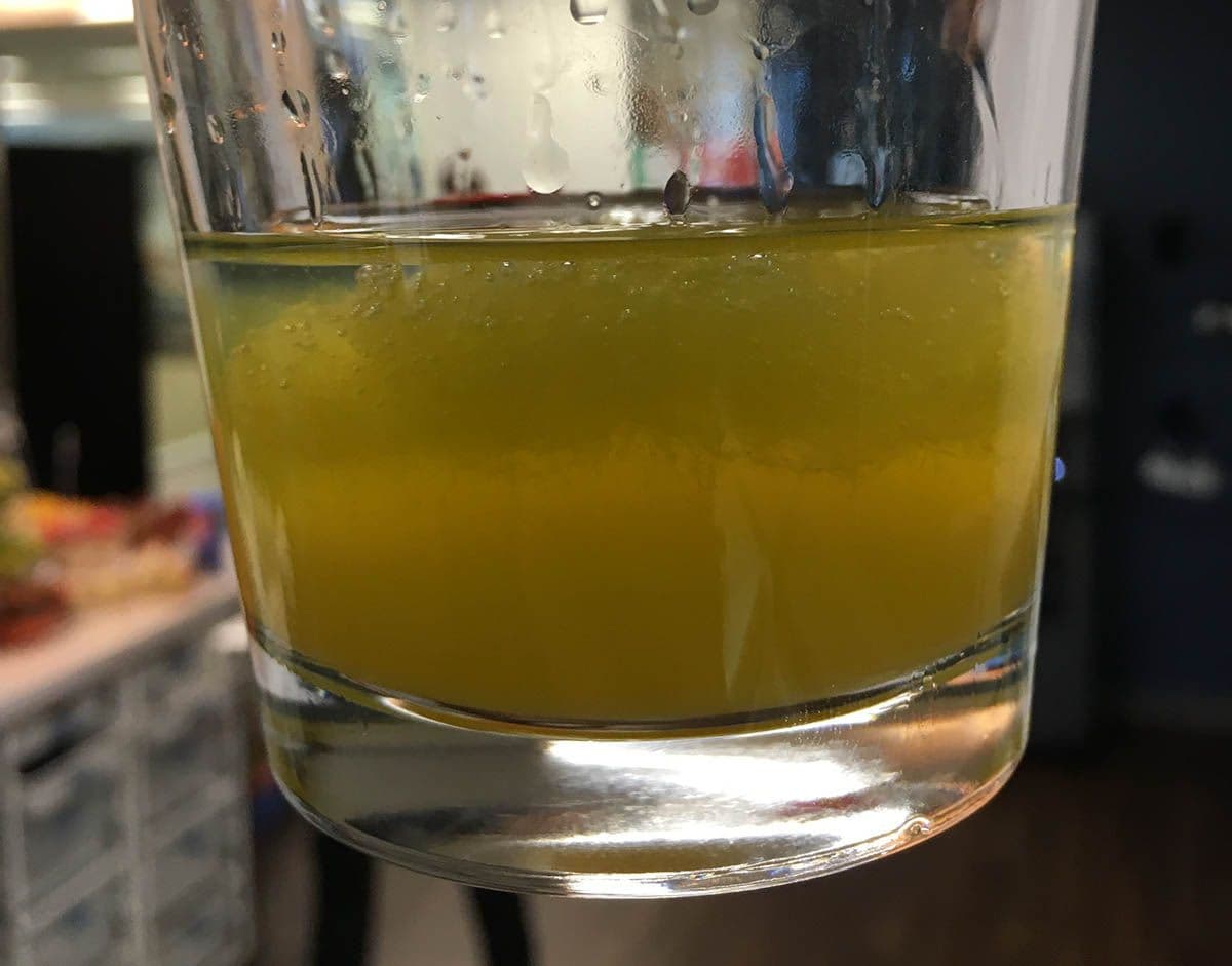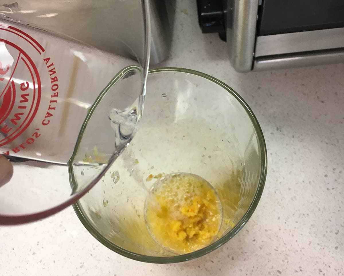 After filtering, you should have an orange liquid (it may be opaque but should not have any chunks, like no-pulp orange juice). Our pumpkin DNA is dissolved in this liquid, and we’ll use alcohol—with help from the salt from earlier—to make it “precipitate.”