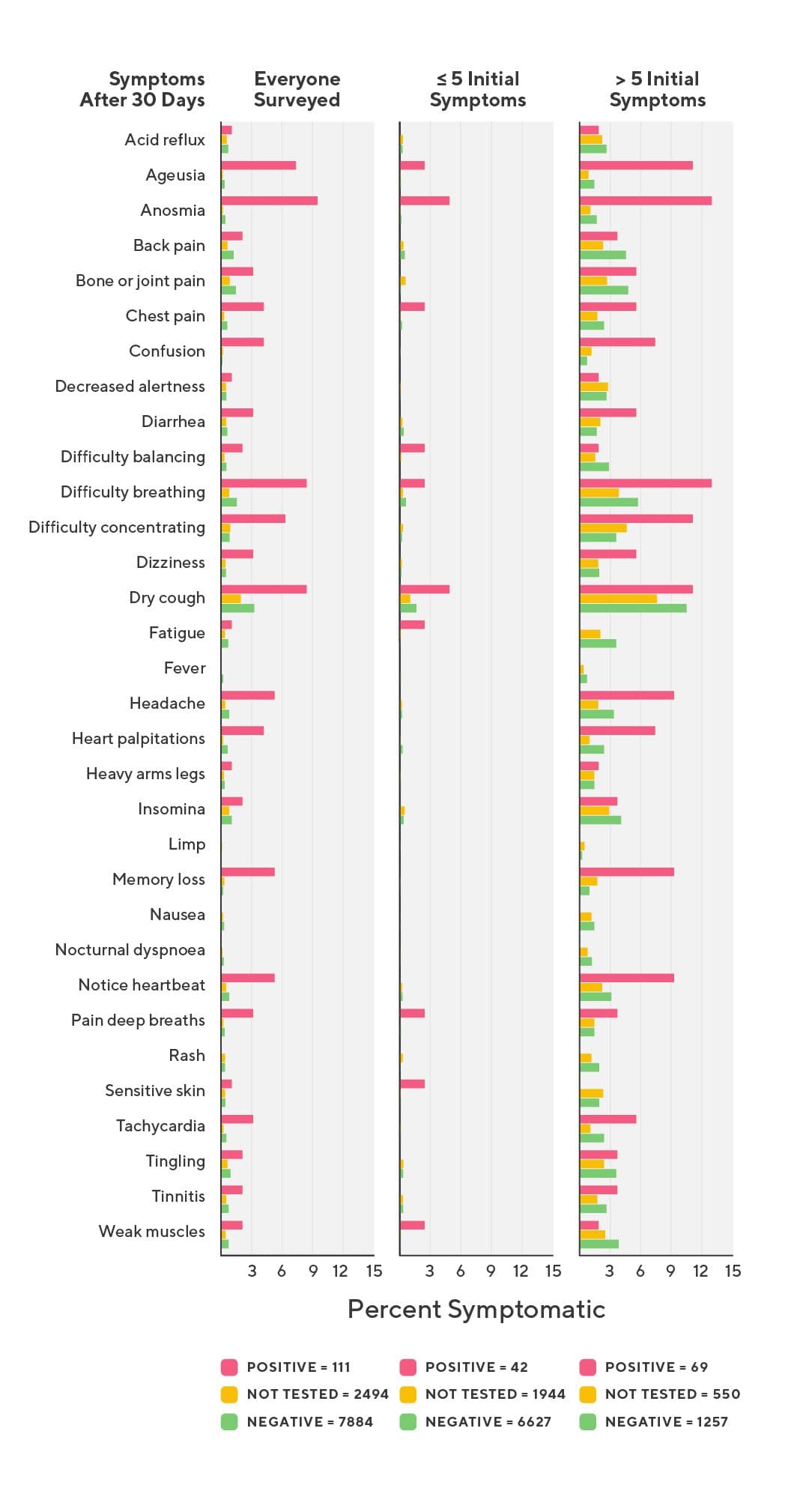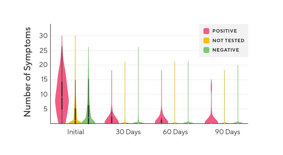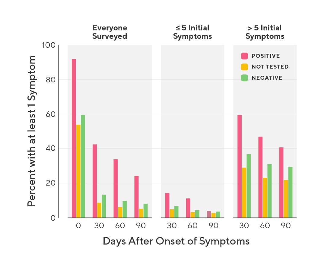 The team of researchers split the data up into groups, first organizing participants’ data based on their testing status and then again based on how many symptoms they initially report having (greater than 5 vs. 5 or fewer). In analyzing each group’s symptoms, researchers found that almost half (43.4%) of people with COVID-19 reported having symptoms that lasted longer than 30 days, and nearly a quarter (23.3%) had at least one symptom persist 90 days after testing positive. In contrast, only 9% of people without COVID-19 reported having symptoms that persisted for periods longer than 30 days.