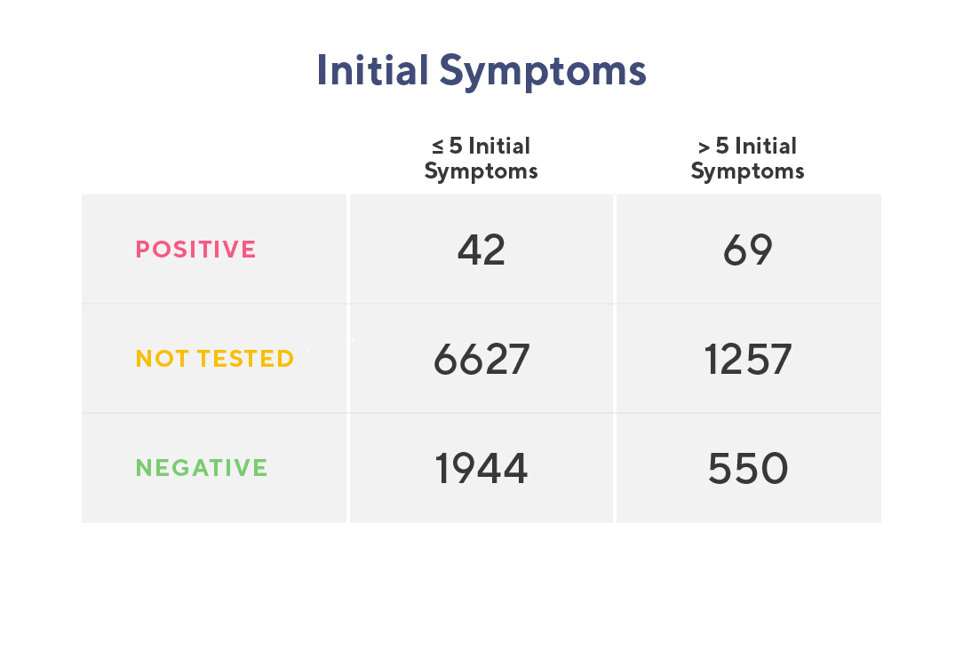 In the course of carrying out various studies using participants’ survey data, researchers recognized a pattern in survey respondents’ symptoms: Among people who had at least one symptom of illness, people who tested positive tended to report experiencing more symptoms than those who tested negative; and, the more symptoms a person had, the longer they were likely to have them. This result was consistent with the findings from previous studies5,6 that were limited to people suffering from severe COVID-19—meaning they had to go to the hospital and in some cases receive mechanical respirators to help them breathe.