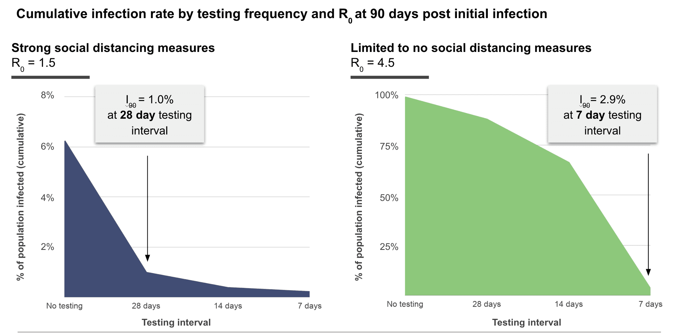 Suppression of viral spread requires reducing R0 below 1. If R0 is below 1, then viral spread collapses.2 50 – 90% of the spread of SARS-CoV-2 is currently estimated to originate from asymptomatic and presymptomatic infected individuals.3,4,5,6 For presymptomatic individuals, the infection period prior to symptoms is estimated to be up to 5 days.7,8 Left undetected, a typical asymptomatic individual may remain infectious for 14 days.3 Due to these unique characteristics, SARS-CoV-2 spreads rapidly in uncontrolled environments. To prevent rapid spread, surveillance testing at regular time intervals, with self-quarantine of infectious individuals, can lower the R0 to below 1.1, 9, 10