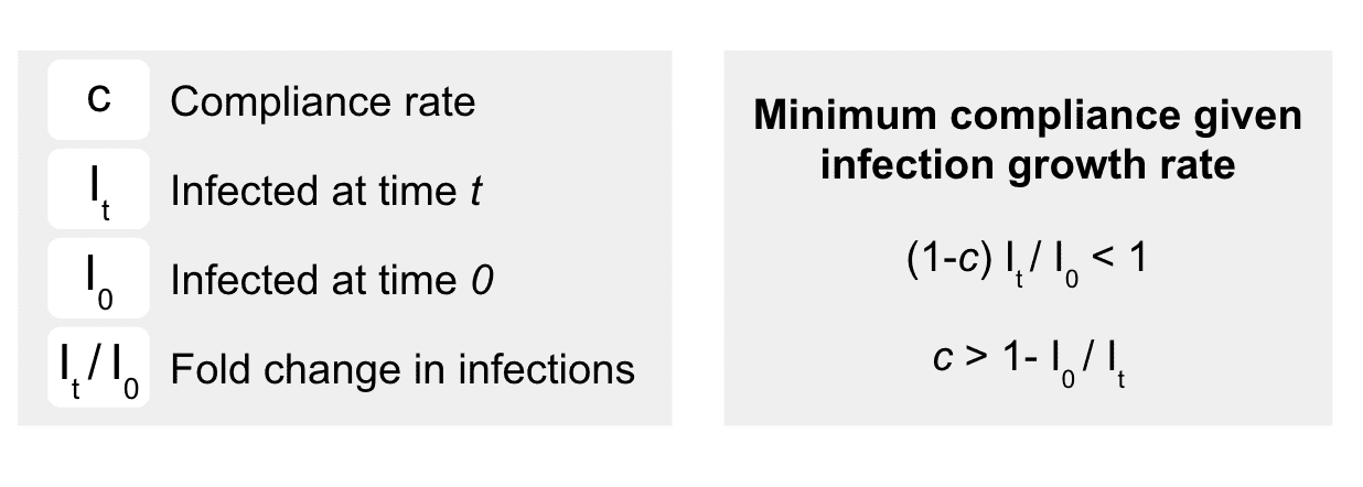 We use an SIR (Susceptible, Infected, and Removed) model to estimate the fold change in infections (It) over both a variety of R0 values and different surveillance intervals (i.e., daily, weekly, bi-weekly, monthly). While surveillance testing can identify symptomatic, presymptomatic, and asymptomatic infections, it is possible testing will not identify all positive cases due to analytical test performance (sensitivity) or biology. In addition, not all individuals will test each cycle, or self-quarantine appropriately. Perfect detection and full compliance, however, are not necessary to keep R0 below 1 for many infection spread scenarios. The minimal total compliance is the total compliance fraction (c) that keeps the increase in infections over an interval of time t (It/I0) from the non-compliers (i.e., 1- c) to less than one.1