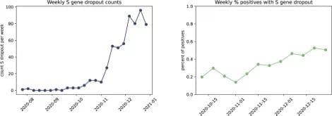 We observe a rise in S gene dropout starting in early October, with 0.25% of our daily COVID-19-positive tests exhibiting this pattern during the first week. The rate of positive samples with S gene dropout has grown slowly over time, with last week exhibiting the highest level yet at 0.5% of COVID-19-positive tests that are consistent with the H69del/V70del variant.