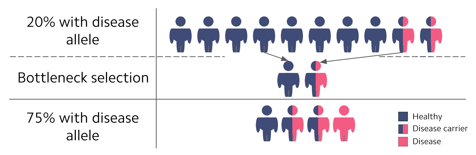 This is how a disease-causing allele (pink) can be overrepresented in a population following a bottleneck.