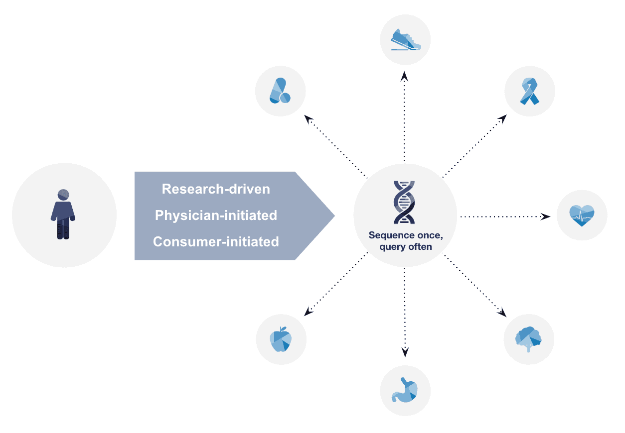Figure 1: Data generated using the Exome+ assay can be used repeatedly over time for various purposes, including disease specific screening, pharmacogenomics, and research.