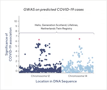 In comparing DNA from people who tested positive or were predicted to have had COVID-19 against those who tested negative or were predicted to have not had COVID-19, the researchers were able to find two genetic factors that appear to be associated with having COVID-19 (more specifically, with having symptoms that would qualify you as a “predicted positive” case).