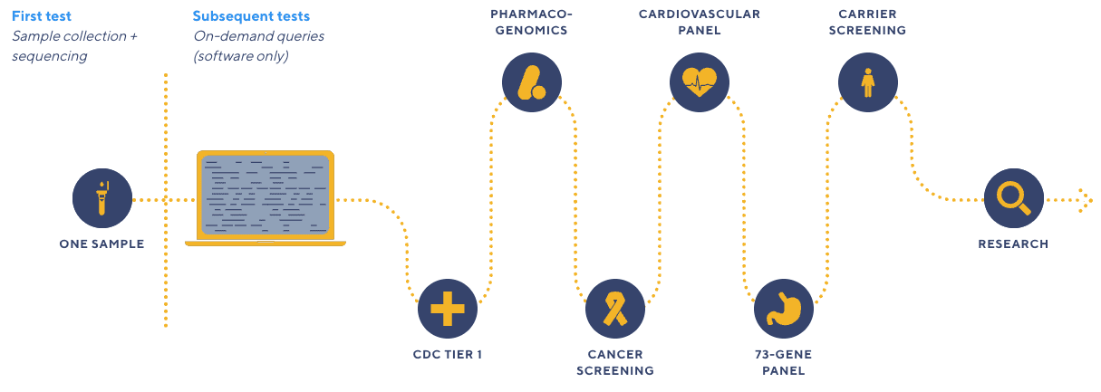 William Lee, PhD, CSO: The Exome+ assay is important to our notion of Sequence Once, Query Often, because it focuses on sequencing and generating the genomic data for every individual for the most important parts of the genome that we believe will have impact to their health care applications. Sequence Once, Query Often is how we think about a future where digital re-use of genetic data is common, and is in fact, the primary way in which people access their genetic data. This is in contrast to the scenario today, where if you need a genetic test, you would have to collect a new sample every time, and you would receive just the answer to the particular question that’s being asked in that case.