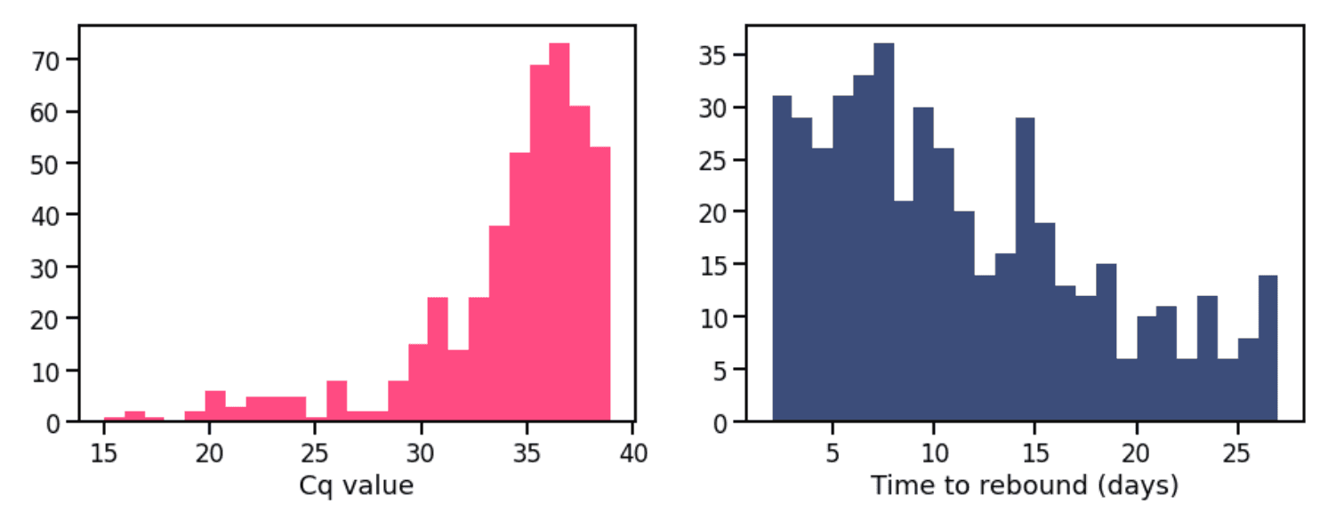 Figure 2. (Left) Frequency of Cq values for first positive test in rebound. (Right) Frequency for time between last positive test in initial infection and first positive test in rebound.