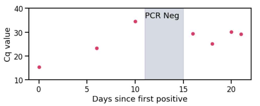 Figure 1. Cq values (cycle threshold quantity) over time from a rebound case. Shaded region indicates period where the patient received a negative test result. Low Cq values indicate high viral load and high Cq values indicate low viral load.