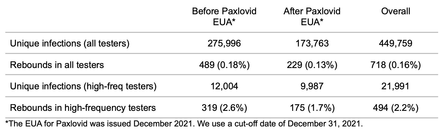 Within the high-frequency testing group, the frequency of rebounds decreased from 2.6% to 1.7% after Paxlovid received authorization. Assuming that our sample includes Paxlovid-treated infections at the same proportion as the general population, this suggests that Paxlovid treatment does not increase the chance of rebound. This result is supported by a study which found that rebounds occurred at a similar frequency in patients taking a non-Paxlovid antiviral.