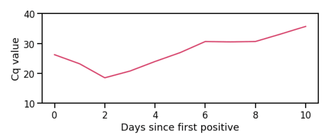 Figure 1: Cq values during one infection. Viral load initially increases (Cq value decreases), then decreases (Cq value increases). Not all patients test early enough to catch the initial decrease in Cq value; often, only the gradual increase in Cq values is observed.