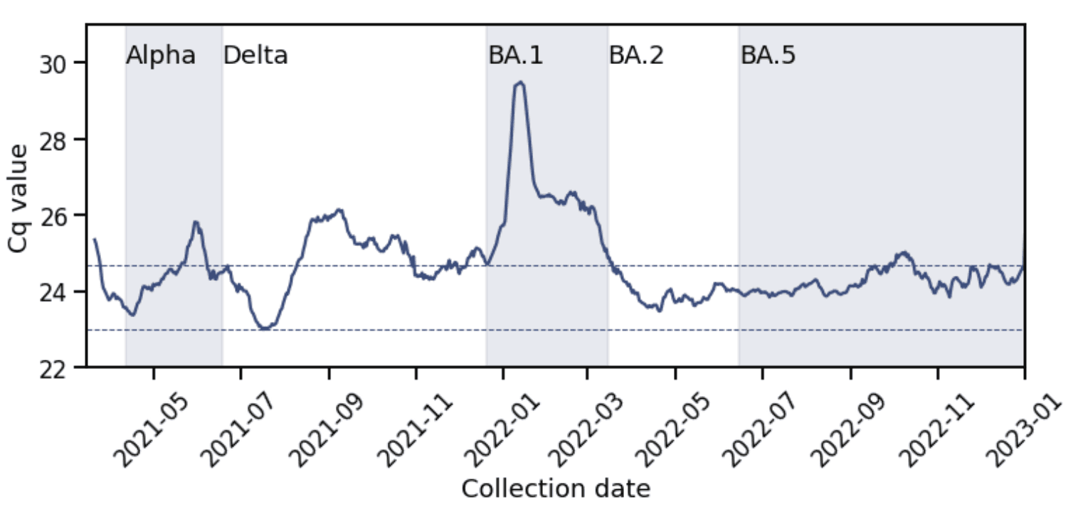 Figure 3: The Delta wave had the lowest average Cq value. The minimum average Cq value during the Delta wave was 23 (lower dashed line) and during the BA.1 wave was 25 (upper dashed line).