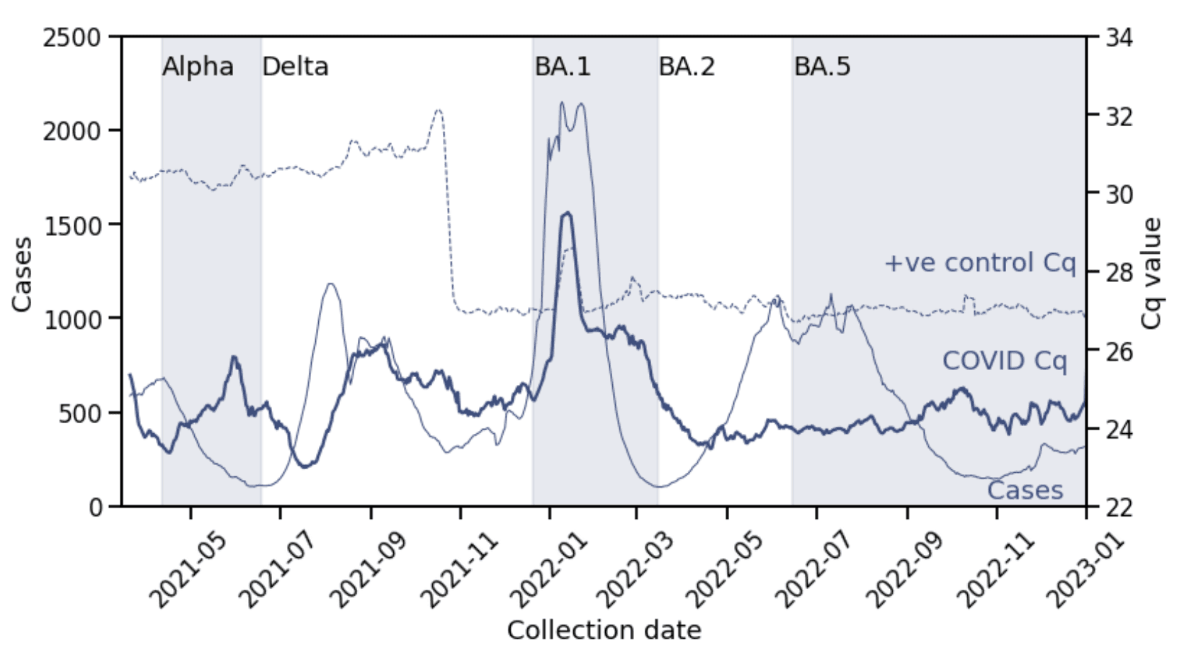 - Average Cq values were their lowest at the beginning of the Delta wave (Cq value of 23, ~2x106 GCE/mL), consistent with the Delta variant causing more severe disease.