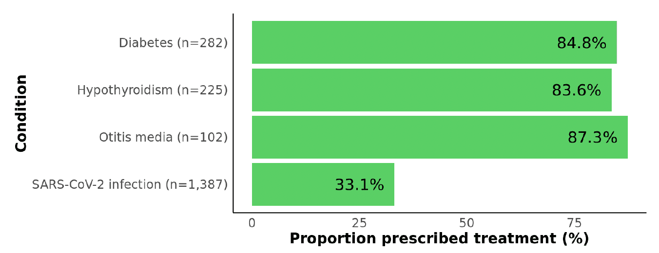 Figure 1: Proportions of patients with each of three control conditions and with SARS-CoV-2 infection who were prescribed a standard-of-care treatment. For each control condition, we evaluated whether at least one medication record consistent with treatment was present: diabetes medication (e.g., metformin, insulin), levothyroxine to treat hypothyroidism, or antibiotic (e.g., amoxicillin) to treat otitis media (within 14 days of otitis media diagnosis).