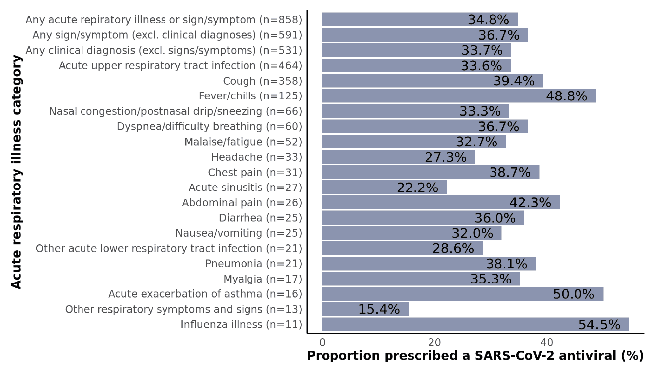 Figure 5: Proportions of non-hospitalized adult SARS-CoV-2 patients who were prescribed a SARS-CoV-2 antiviral stratified by acute respiratory illness diagnosis subgroups. Clinical diagnoses included acute asthma exacerbation, acute chronic obstructive pulmonary disease (COPD) exacerbation, acute respiratory distress syndrome (ARDS), acute respiratory tract infection, acute sinusitis, influenza illness, other acute lower respiratory tract infection, pneumonia, and respiratory failure. All other conditions were classified as signs or symptoms. Data are not shown for subgroups with fewer than 10 patients including abnormal sputum, acute COPD exacerbation, ARDS, altered mental state/level of consciousness, asphyxia/hypoxemia, disturbance of smell/taste, ear pain, hemoptysis, pleurisy, rash, respiratory arrest, respiratory failure, sepsis, and throat pain/difficulty swallowing.