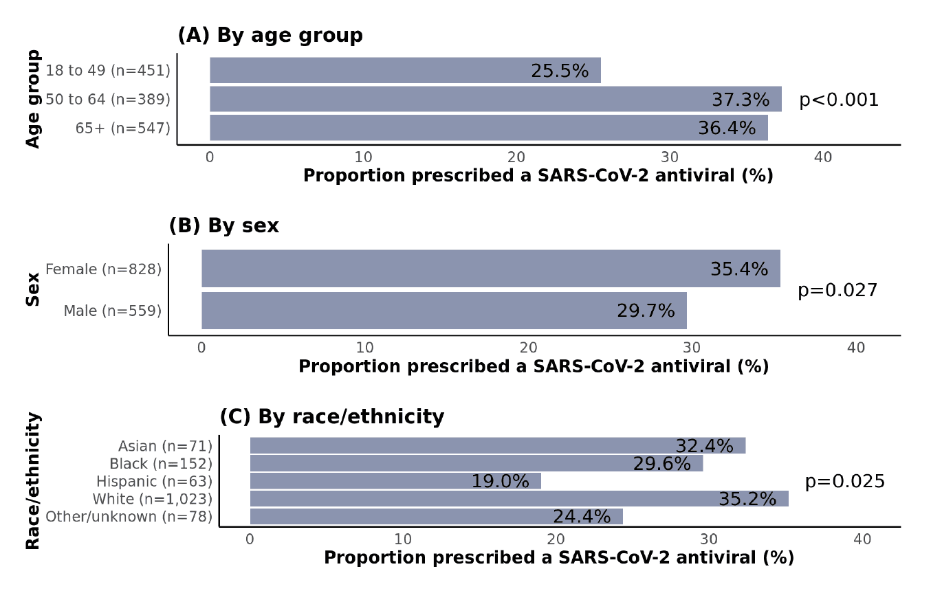As expected, patients aged ≥50 years were more likely to receive an antiviral than those aged 18-49 years, yet the proportion was only 36-37% in both 50-64 and ≥65 age groups (Figure 2). Females were more likely to be treated than males, and non-Hispanic white patients were most likely to receive treatment compared with racial and ethnic minorities; in pairwise comparisons, this difference was only statistically significant for Hispanic vs. non-Hispanic white patients (p=0.011). In 2022, two national EHR studies (PCORnet and Cosmos) found that Hispanic as well as Black patients were less likely to receive antiviral treatment than non-Hispanic white patients. Contributing factors may include social-structural barriers such as limited knowledge of treatment options, language barriers, medical mistrust, lower willingness to take medications, lower utilization of telemedicine services, and implicit biases among providers.