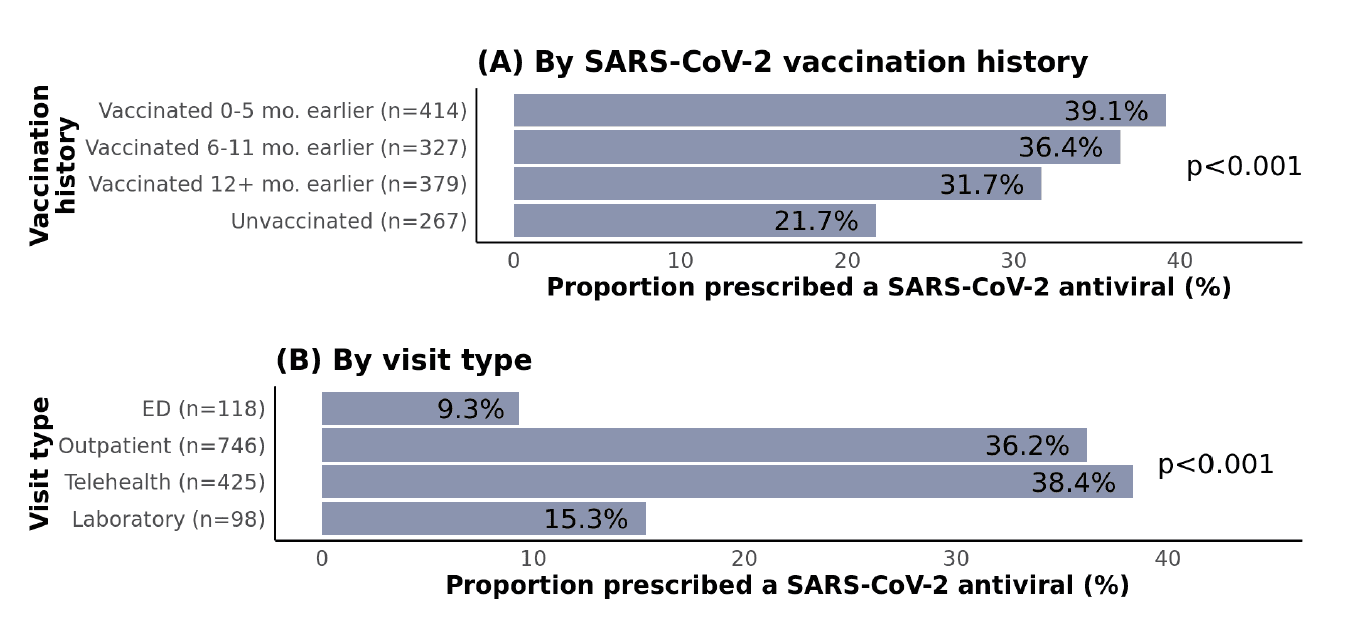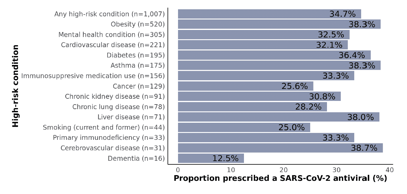 - Among 1,387 non-hospitalized adult SARS-CoV-2 patients at risk for progressing to severe disease, only 33% were prescribed a SARS-CoV-2 antiviral as part of clinical care, which was substantially lower than the 84-87% prescribed standard-of-care treatment for each of three different control conditions unrelated to SARS-CoV-2.