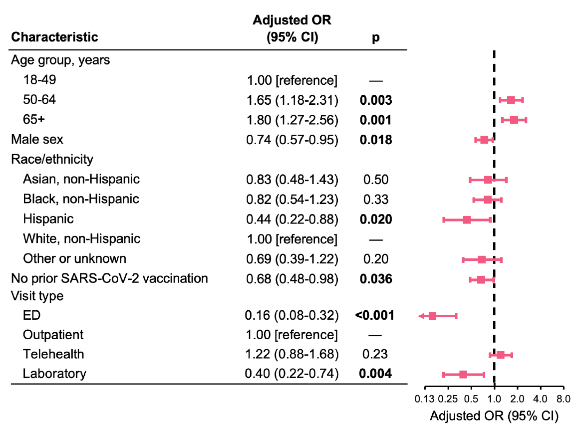 In multivariable analysis, ages 50-64 and ≥65 (vs. 18-49) remained significantly associated with a greater likelihood of receiving an antiviral prescription (Figure 6). Male sex, Hispanic ethnicity (vs. non-Hispanic white), no prior SARS-CoV-2 vaccination (vs. vaccinated), and ED and laboratory-only visits (vs. outpatient visits) remained significantly associated with a lower likelihood of receiving an antiviral prescription (Figure 6).