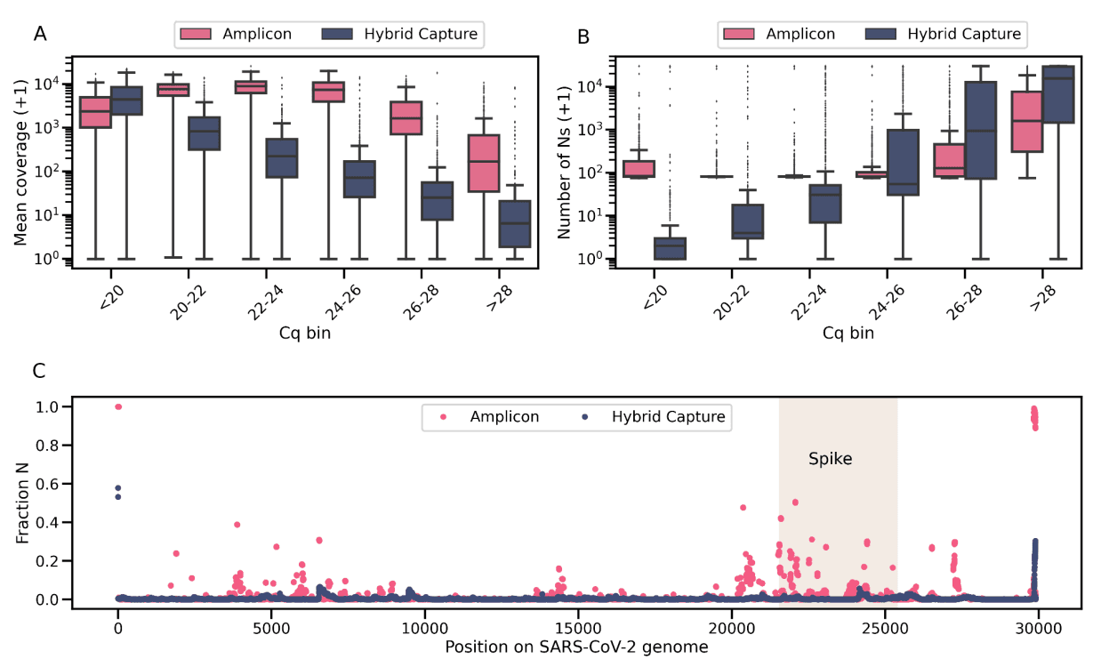 As Figure 4b illustrates, even at low Cq values, the amplicon workflow generates sequences that have more Ns than the hybrid capture workflow. First, there is a minimum of 75 uncertain bases (Ns) due to 25 bp on the 5’ of the genome and 50 bp on the 3’ end of the genome which are not covered by the non-primer portion of any amplicon. Second, with the amplicon method, many positions within the SARS-CoV-2 genome drop out, i.e. there are intermittent regions of zero read coverage: multiple positions in the Spike region have >20% of passing consensus sequences reporting an N at that position (Figure 4c). In contrast, the hybrid capture workflow exhibits much lower levels of drop-out, and the completeness of the consensus sequence decreases in a predictable manner with increased Cq values, because the increase in Ns is primarily due to lower genome-wide coverage. For these reasons, and especially due to the highly mutated and dominant Omicron variant, Helix will run samples exclusively through the hybrid capture workflow going forward.