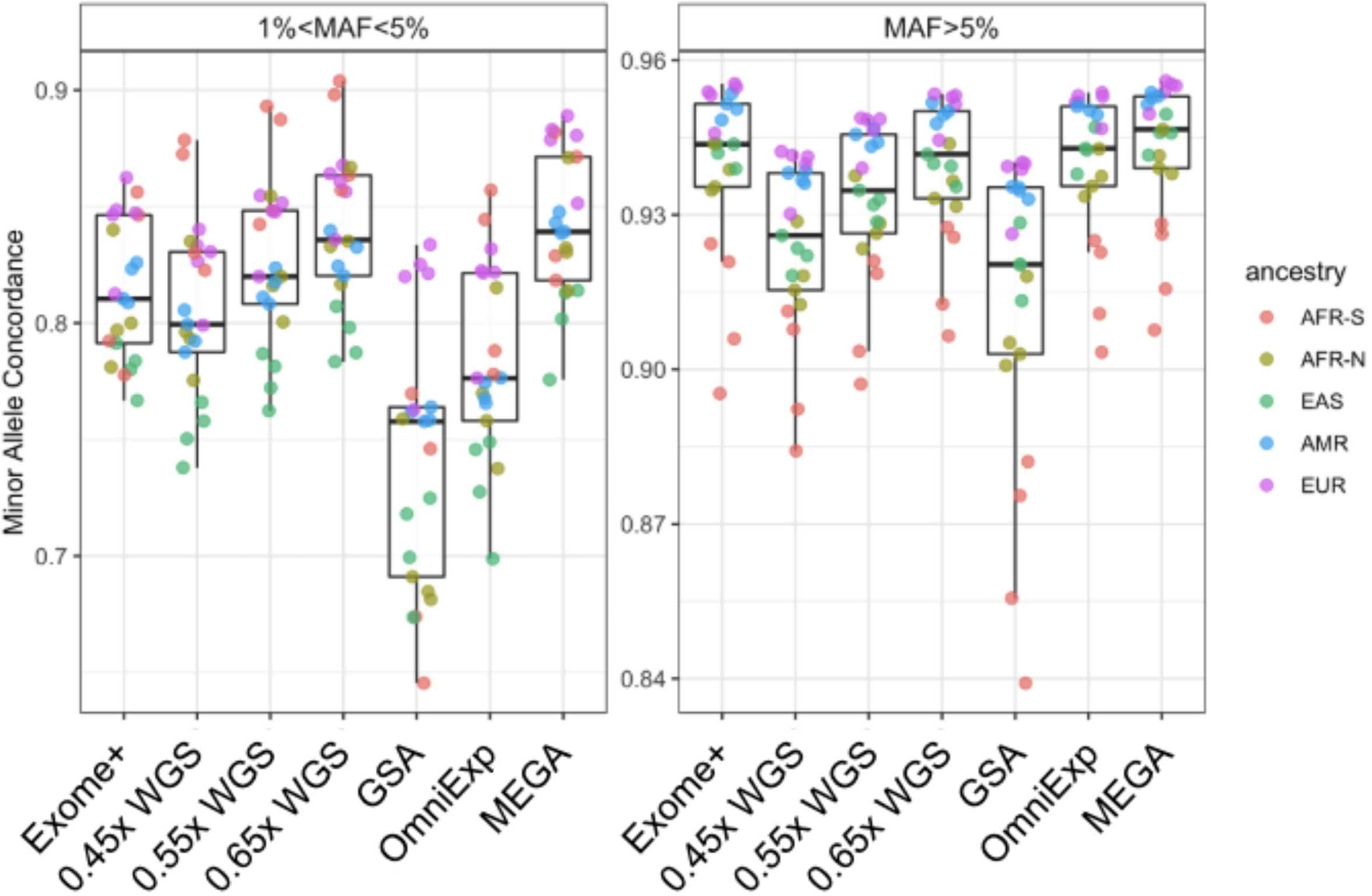 Figure 2: Demonstration of minor allele concordance between imputed variants and directly sequenced variants across five ancestral populations. Results are presented for typical Exome+ runs, WGS at different coverage levels (0.45x, 0.55x, 0.65x), and three microarrays (GSA, OmniExp, and MEGA). AFR-S: Sub-saharan African. AFR-N: North African. EAS: East Asian. AMR: Indigenous American. EUR: European.