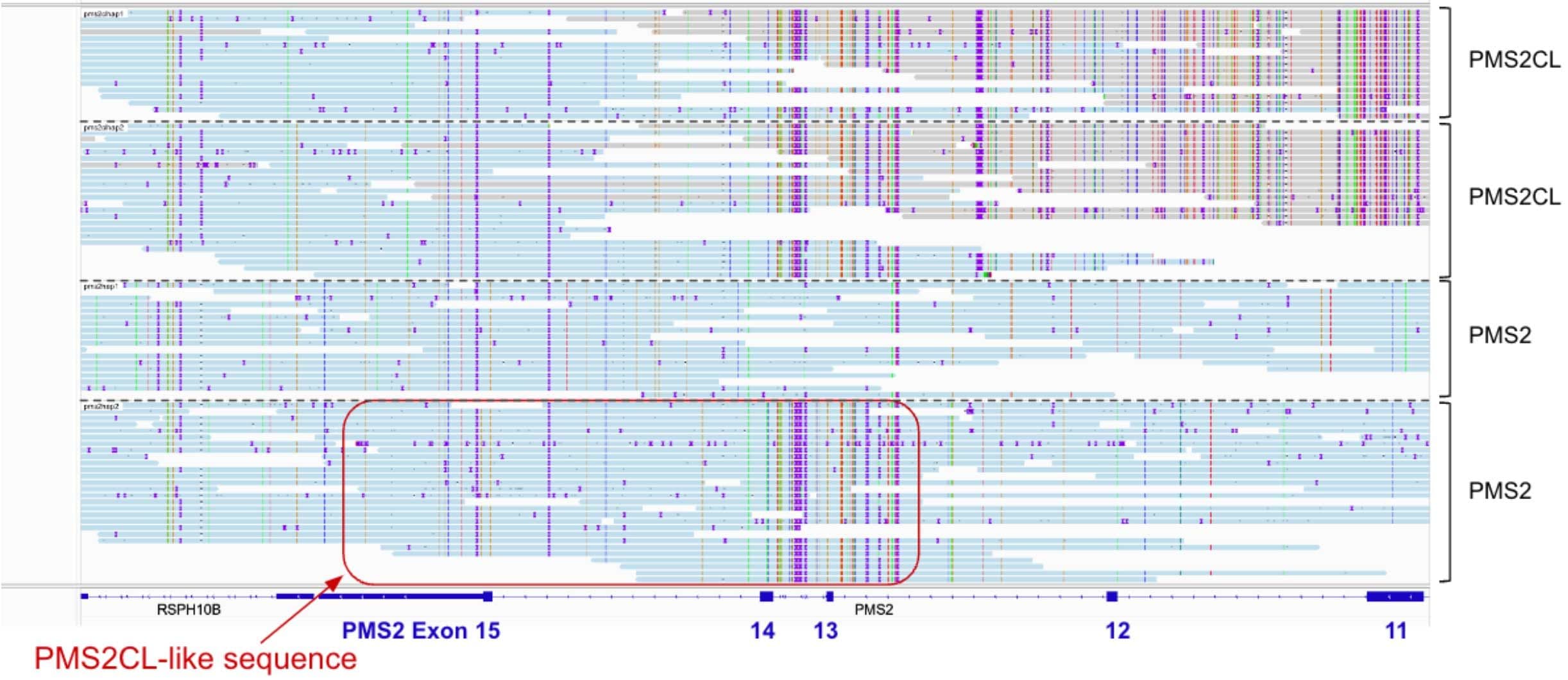 All variants are confirmed before reporting. Confirmation methods include visual inspection of the reads in simple cases such as SNVs with clear allele fractions and no concerning genomic context, short read whole genome sequencing for more complicated small variants and CNVs, and long read sequencing when appropriate. All PMS2 variants in terminal exons are confirmed by PacBio long reads. This allows us to confidently determine which variants are in PMS2 and which are in PMS2CL, and also to identify gene conversion events such as the one seen in Figure 1.