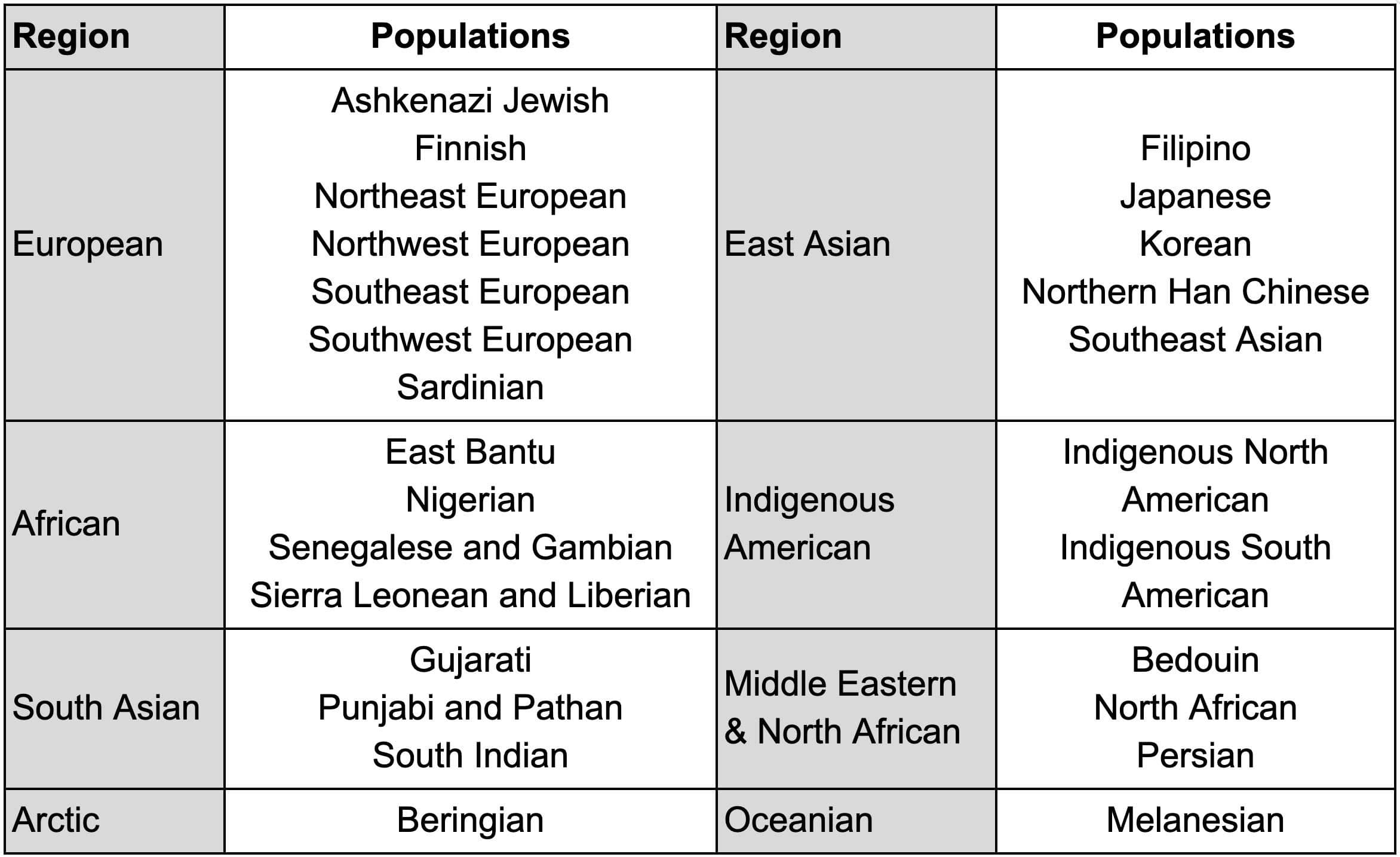 Table 5: List of 26 populations, grouped into eight regions, calculated by Helix.