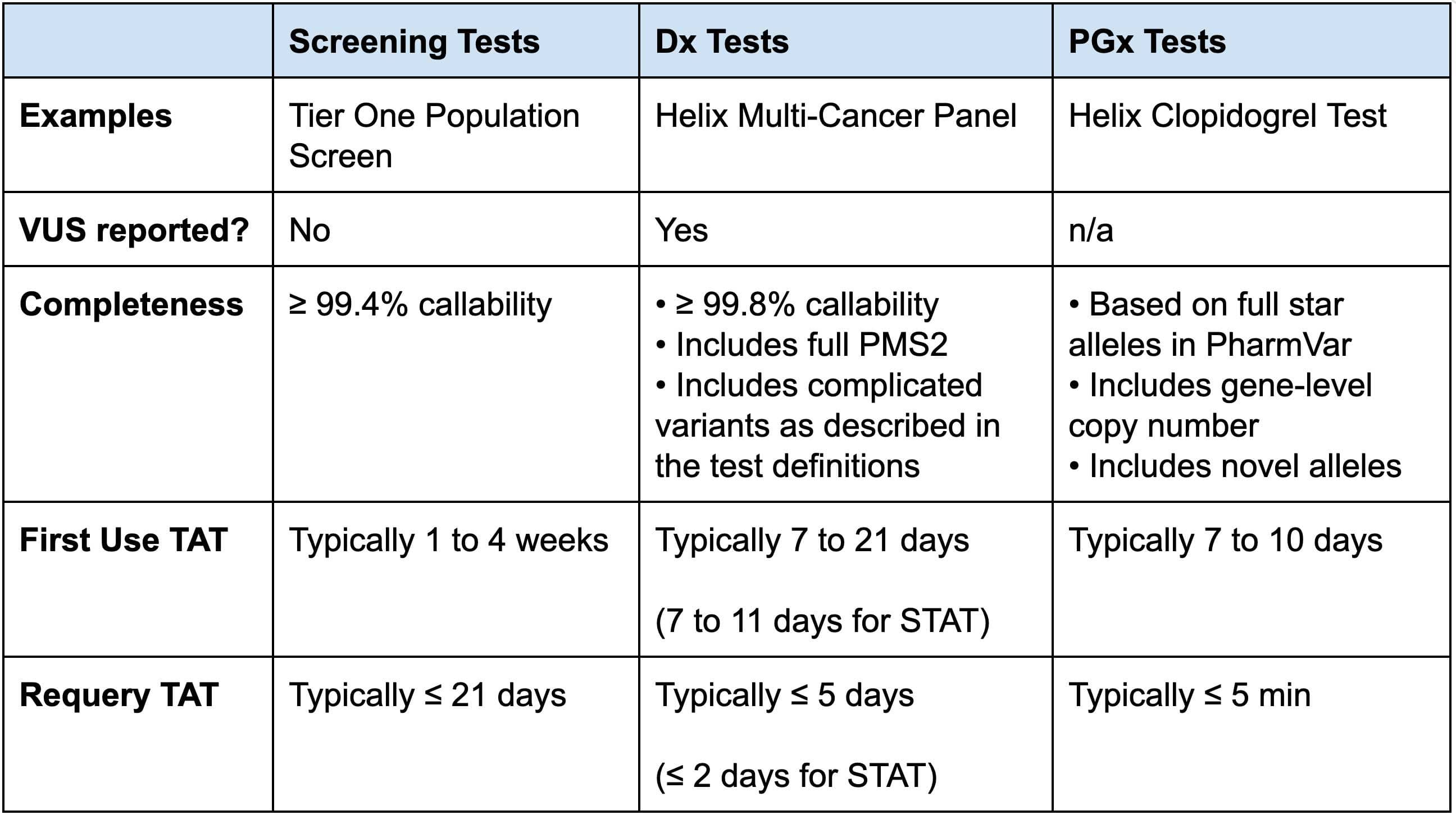 Helix’s Exome+ assay has been designed to be used for a wide range of testing categories and additional informatic tools or procedures to ensure fast turnaround times are implemented according to the tests’ specific needs (Table 4). This enables Helix to offer a variety of high-quality efficient testing options based on a single sample and sequencing.