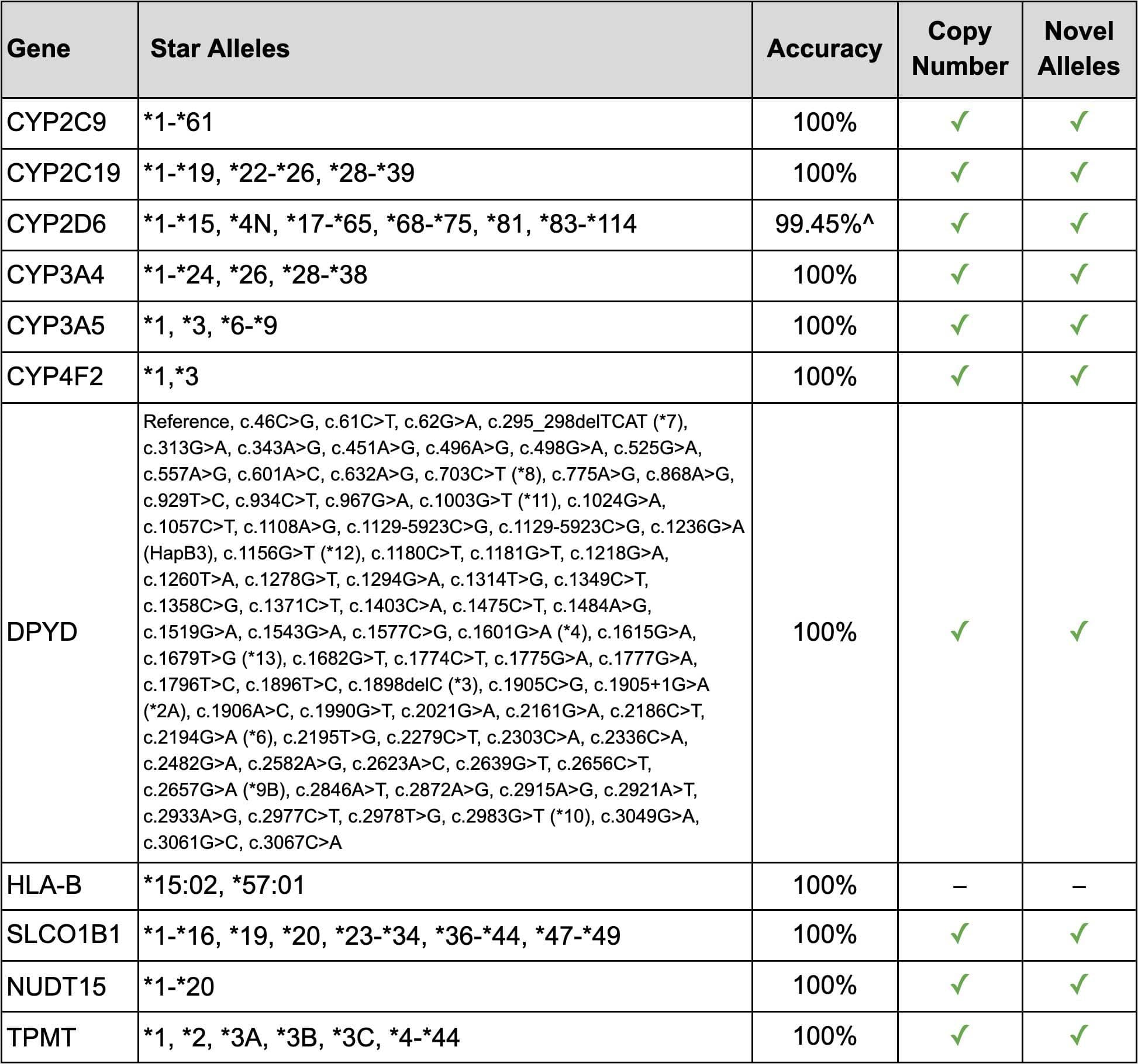 Table 2: Summary of reportable and analytical range and accuracy for Pharmacogenomic genes with star alleles on the Exome+ assay. Not listed, but included in our tests, are individual SNPs such as for VKORC1.