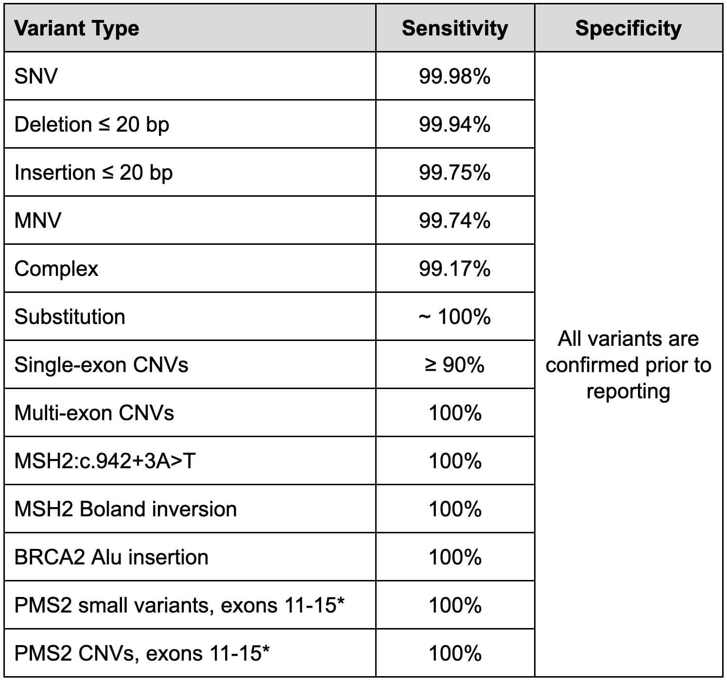 Small variants and copy number variants (CNVs) are generated across the full exome, with performance of these variants captured in Table 1. Small variants are called using a customized version of Sentieon while all other variant types are called using proprietary algorithms, including CNVs which are detected by both read depth and split reads. For variants that are more challenging— for example, due to interference by pseudogenes (e.g. PMS2 terminal exons) or special variant types (e.g. the MSH2 inversion also known as the Boland Inversion)— specialized informatics are applied and a special validation is performed.